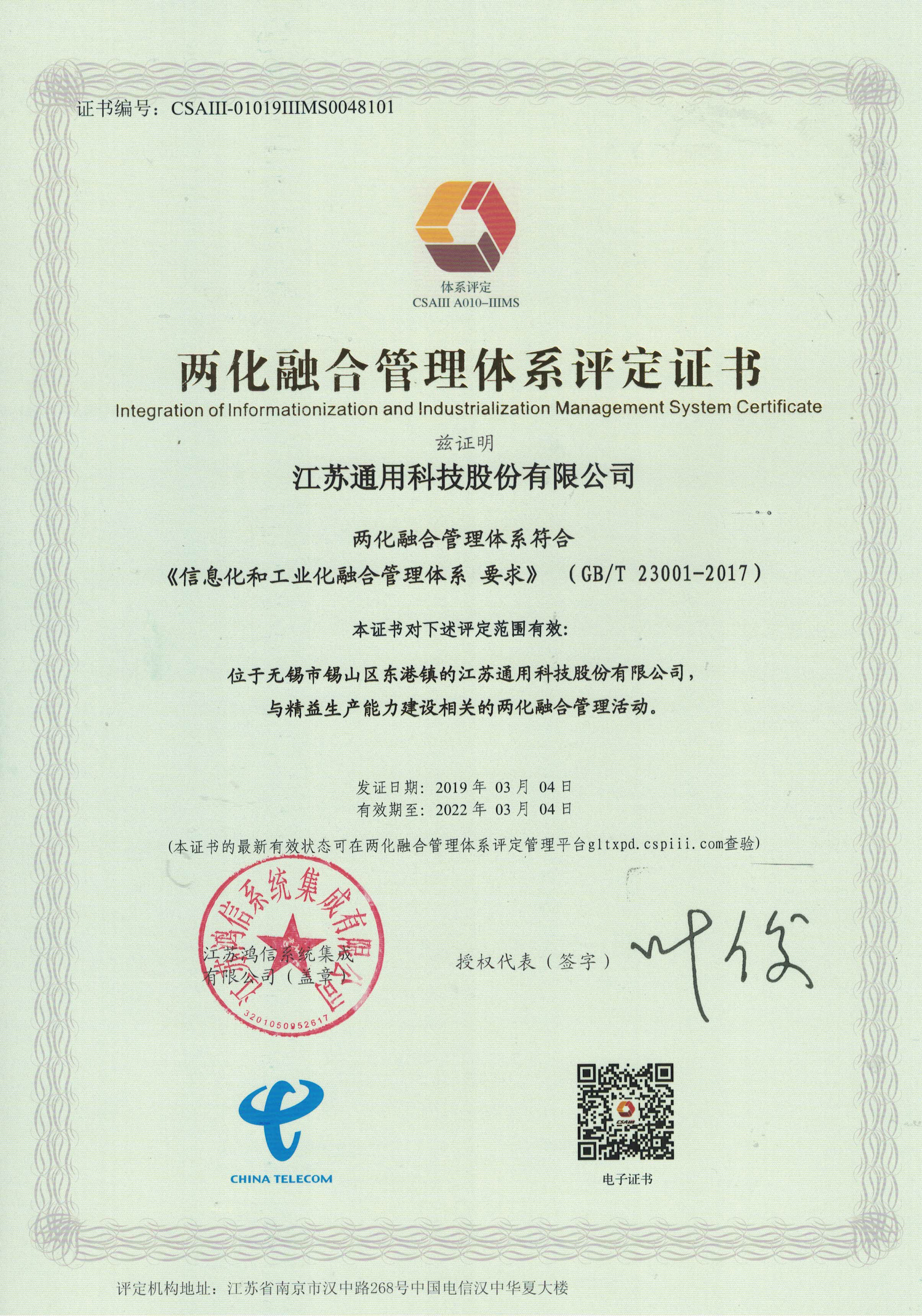 近日,通用股份顺利通过国家两化融合管理体系评定并获得证书,评定范围是与精益生产能力建设相关的两化融合管理活动,标志着公司在推