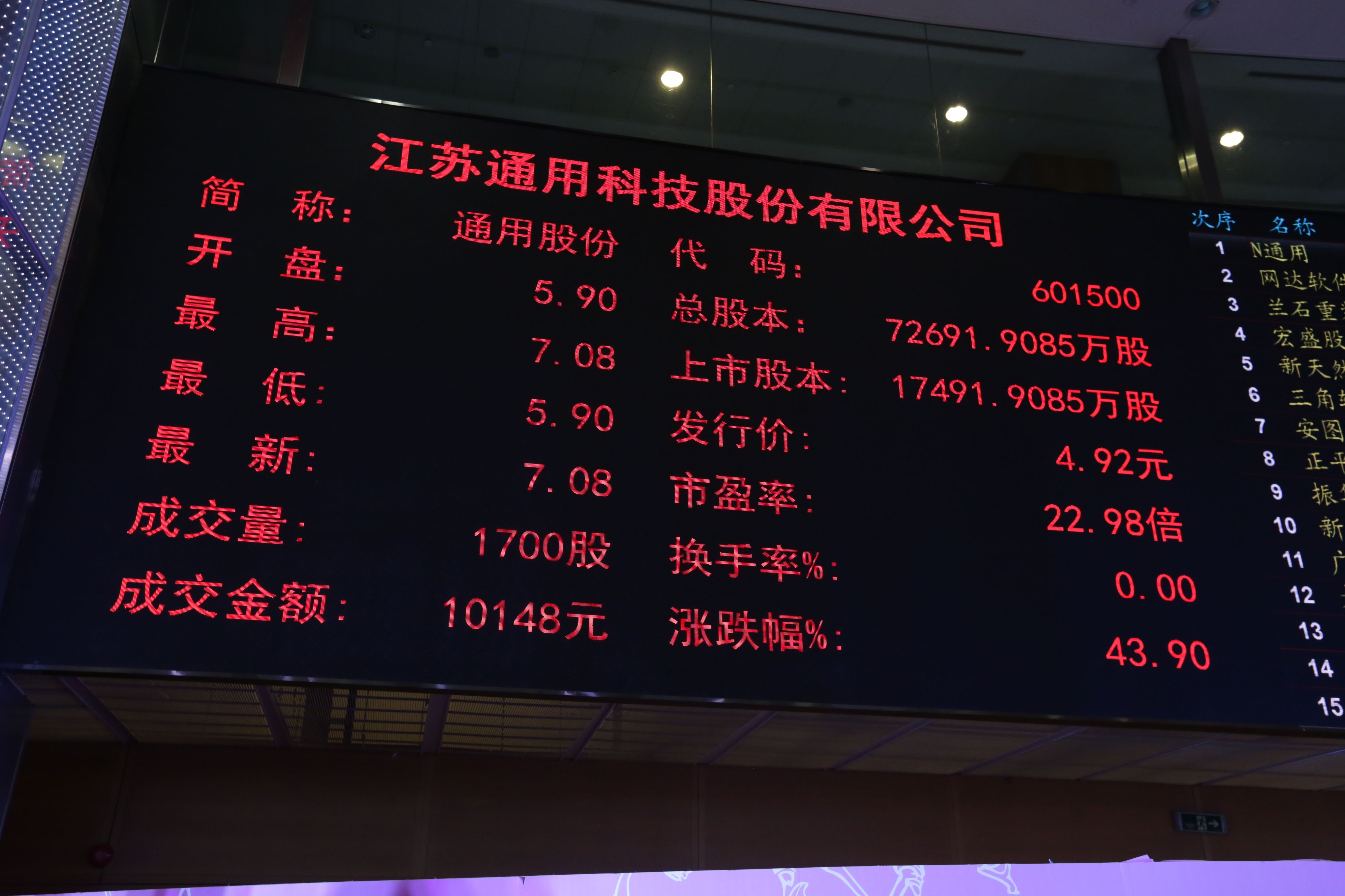 股市开盘,通用股份开盘价达5.9元,随后股价被推至7.08元,较发行价上涨43.90 %,牢牢地封在涨停板上,充分说明资本市场对通用股份的信心。通用股份将充分利用上市契机,以打造民族轮胎高端品牌为己任,成为具有国际影响力的中国轮胎标杆企业,为社会创造价值,给广大投资者创造财富!