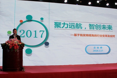 荣成市隆通贸易有限公司总经理张黎明在大会上作了题为“腾飞 2018”的主题演讲,他从定位、服务、客户管理三个渠道入手,向与会者分享了成功的营销经验和营销体系构建案例,为代表们日后在市场上攻城拔寨提供了可实施性的参考经验。