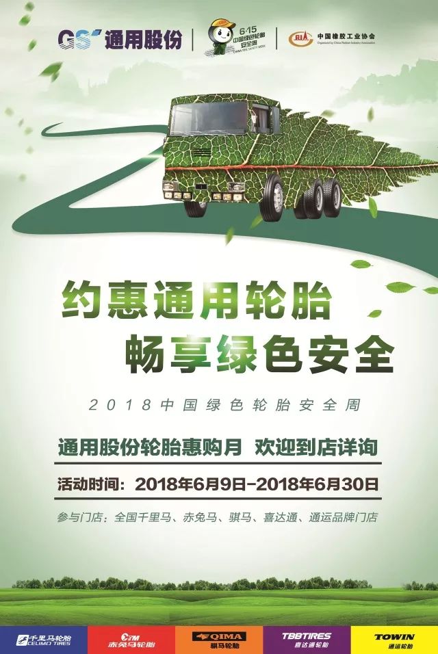 为了让更多的普通消费者了解什么是绿色节能轮胎,轮胎标签的作用,以及轮胎安全使用知识,同时也为了答谢消费者长期以来的支持,通用股份在全国通用品牌门店(千里马、赤兔马、通运、骐马、喜达通)开展“约惠通用轮胎 畅享绿色安全”的轮胎惠购活动(2018年6月9日至6月30日),并采取满减优惠、幸运抽奖、好礼相送等形式,以实实在在的优惠,与消费者共同拥抱安全出行。