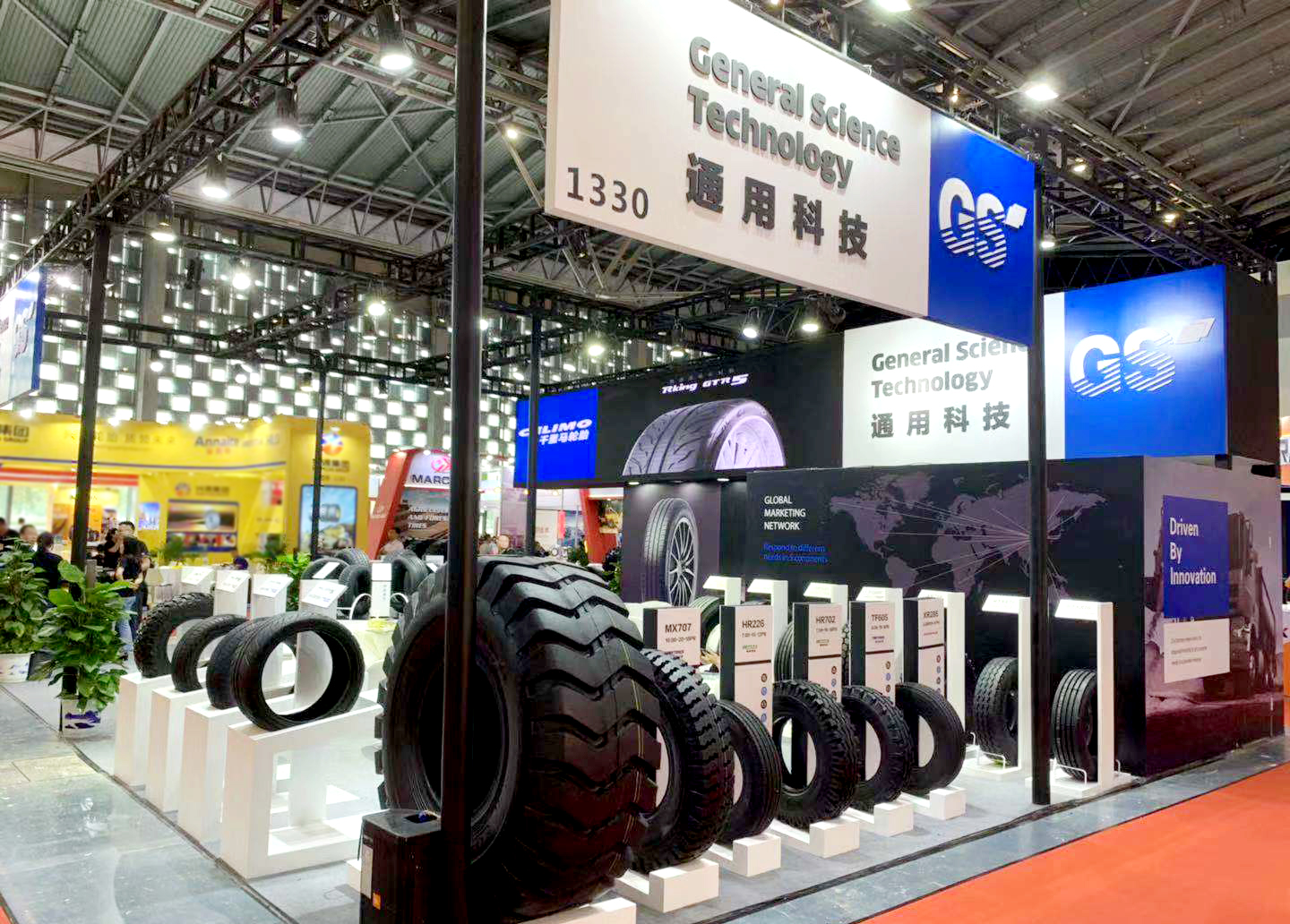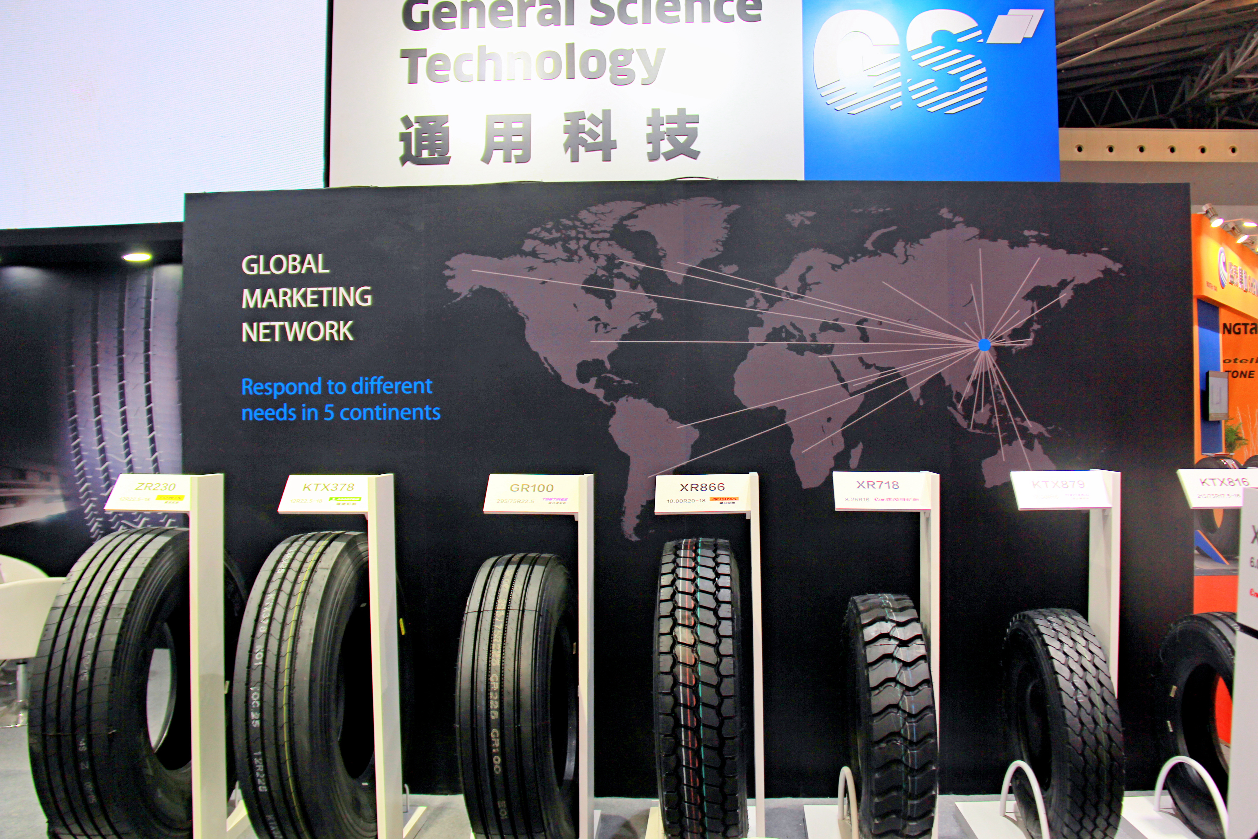本次展会,通用股份展台设计以标志性品牌颜色——蓝色为主题调,展厅整体色系统一、层次鲜明,凸显了通用股份科技、创新、未来的产品设计理念,向用户展示了通用始终以提升创新能力为核心,大力推进智能制造,打造世界一流民族轮胎品牌的发展愿景。
