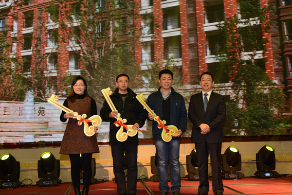 为三位高级人才代表颁发红豆新居