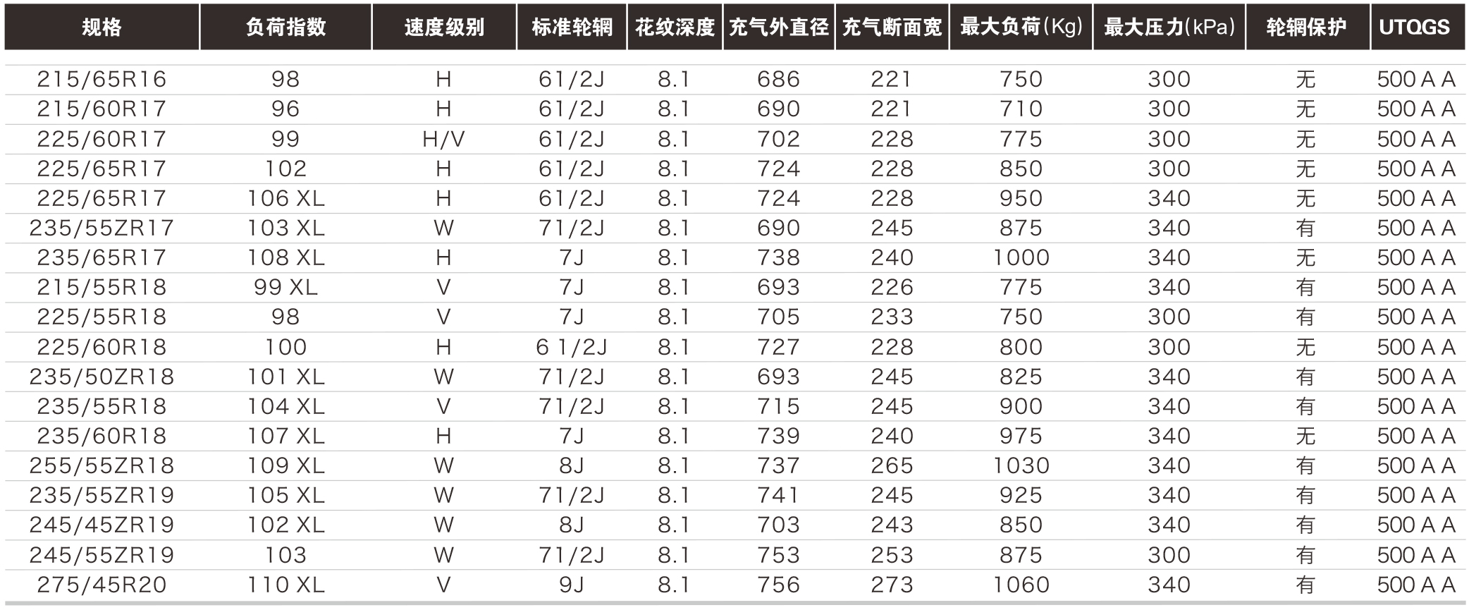 胎面非对称的花纹,针对城市SUV的特点,提供优异的干湿地性能。