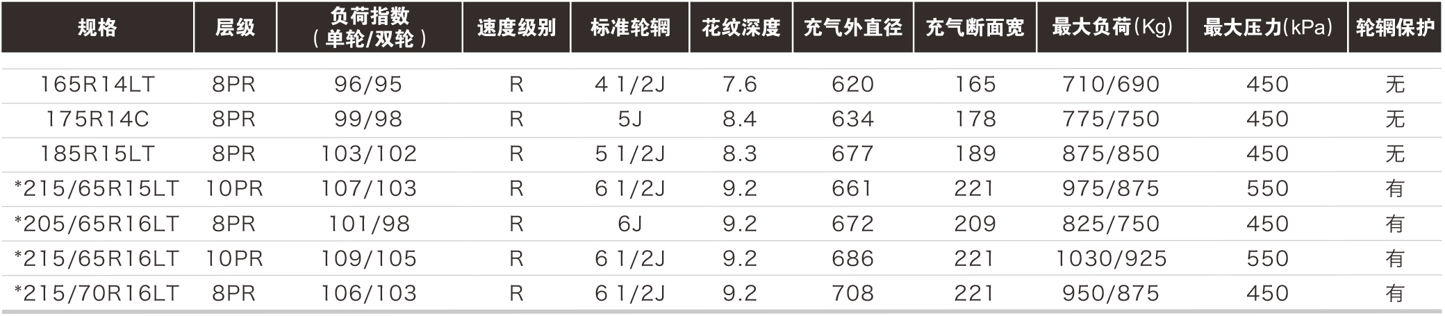 具有优异的耐久品质,加强的胎体结构及超高耐磨配方的使用,高强度骨架材料,加强型轮胎结构设计,提供更加安心的驾驶稳定性和高承载能力。