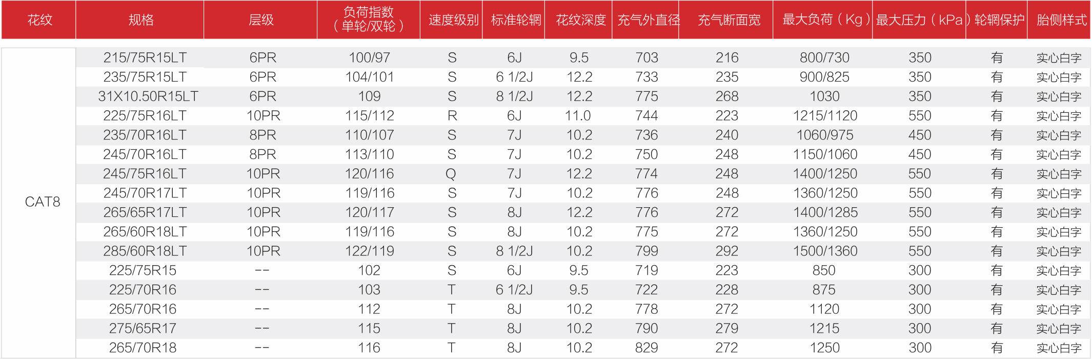 GUANYU A/T CAT8拥有曲折花纹沟设计,适应各种恶劣路况。连贯的横向倾斜沟槽在湿地路面有效排除积水,提供持续稳定的抓地能力。全新耐磨配方,适合比较苛刻的路面,保证了轮胎寿命。