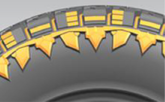 外观富有立体感,更加强壮,为胎侧提供有效防护,提高耐撞耐刺性能;花纹沟底部增加弹石子结构,保证花纹抓地力 。